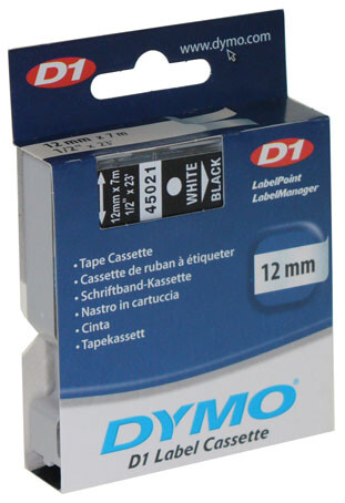 45021 DYMO páska D1 plastová 12mm, bílý tisk / černý podklad, návin 7m