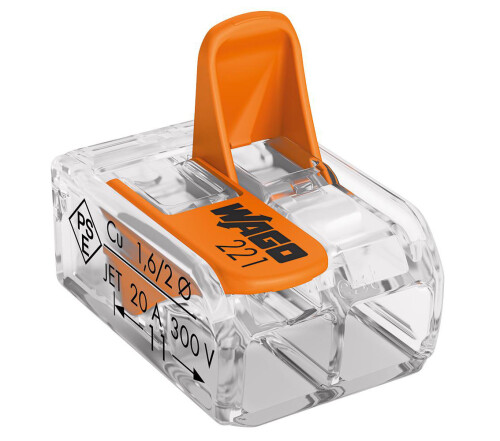 Krabicová bezšroubová svorka WAGO s páčkami, průřez 2x0,2-4mm2, pro plný drát i lanko, transparentní
