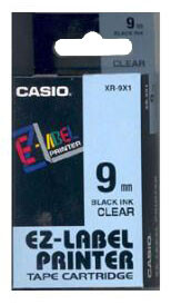 Páska CASIO originální plastová samolepicí šíře 9mm, černá na průhledném, návin 8m