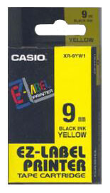 Páska CASIO originální plastová samolepicí šíře 9mm, černá na žlutém, návin 8m