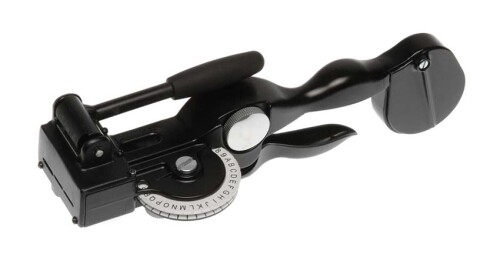 Štítkovač pro hliníkové a nerezové pásky šíře 12mm. Přístroj do pásek znaky vytlačuje prostřednictvím otočné vestavěné raznice.
